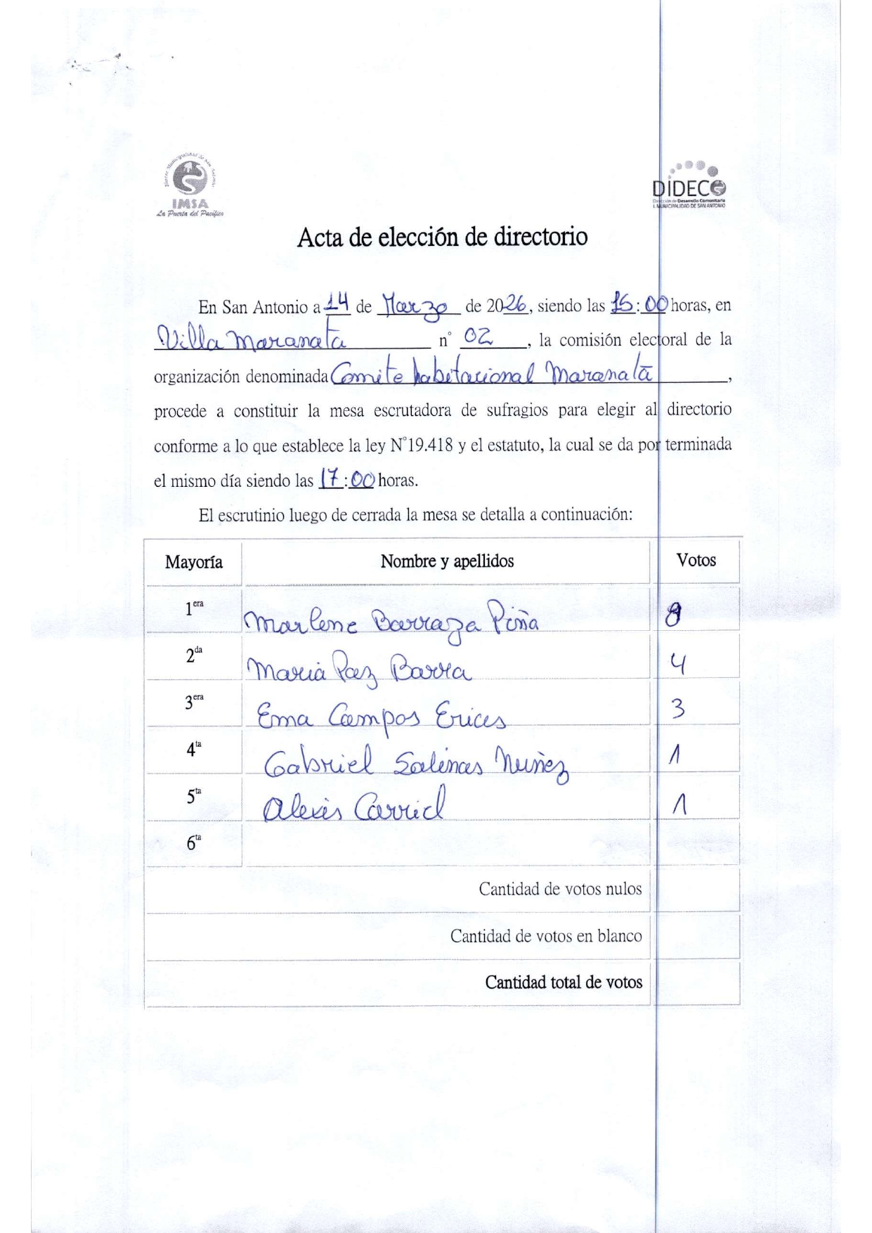 Acta de elecciones COMITE HABRITACIONAL MARANATA