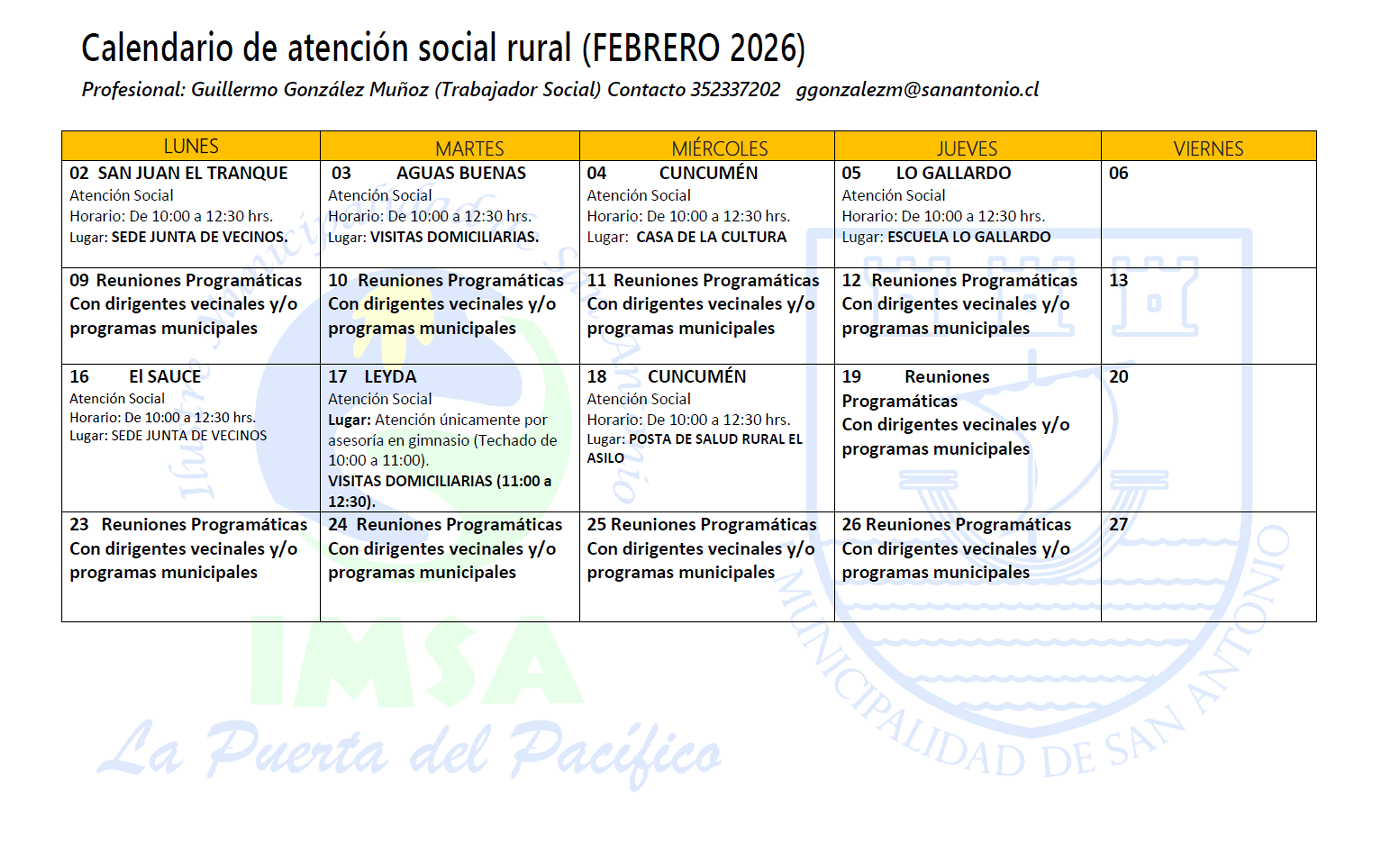 Lunes a jueves (jornada de mañana). Atenciones extraordinarias según contingencia.