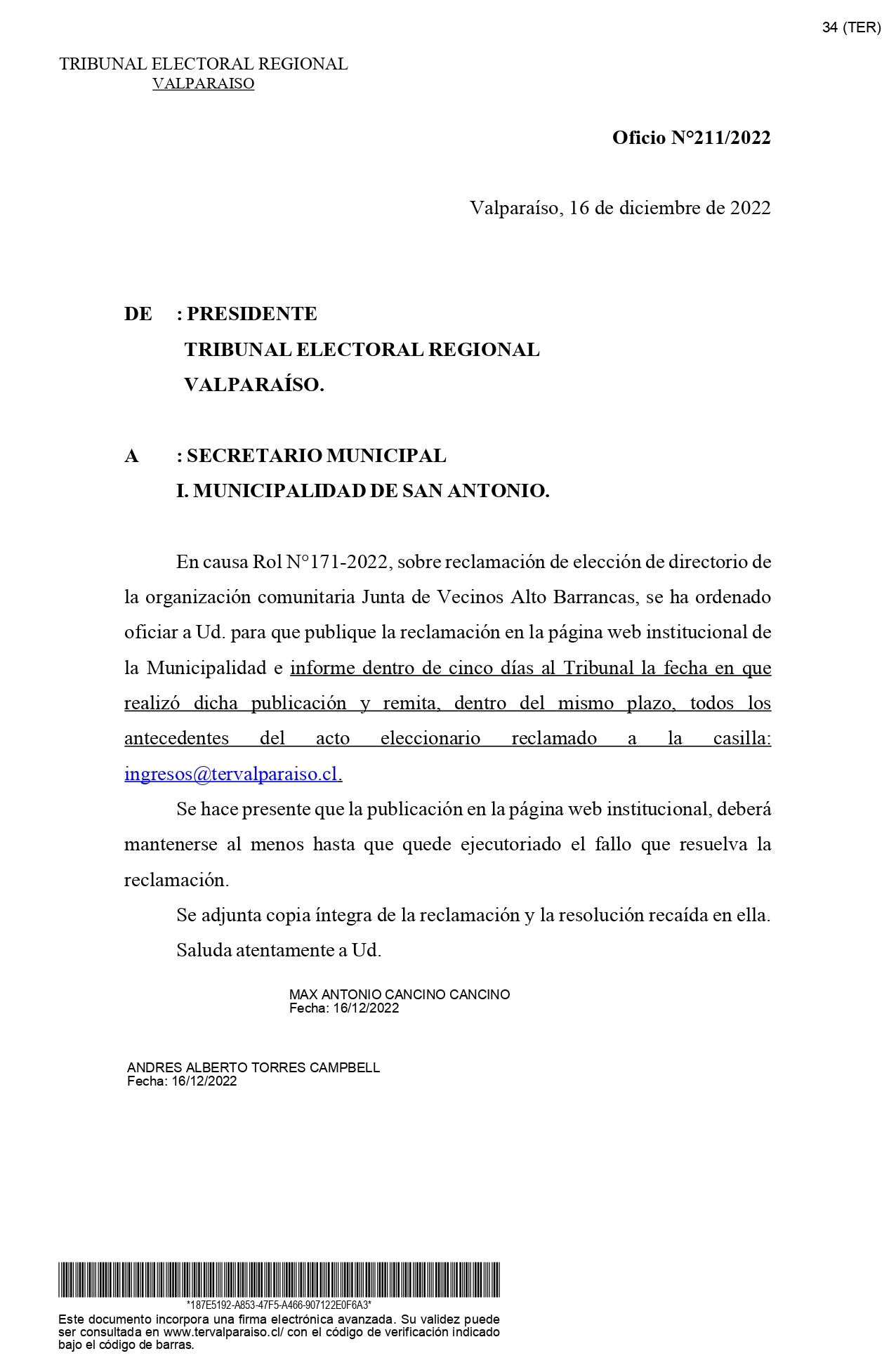 Reclamación de elección de directorio de la organización comunitaria Junta de Vecinos Alto Barrancas